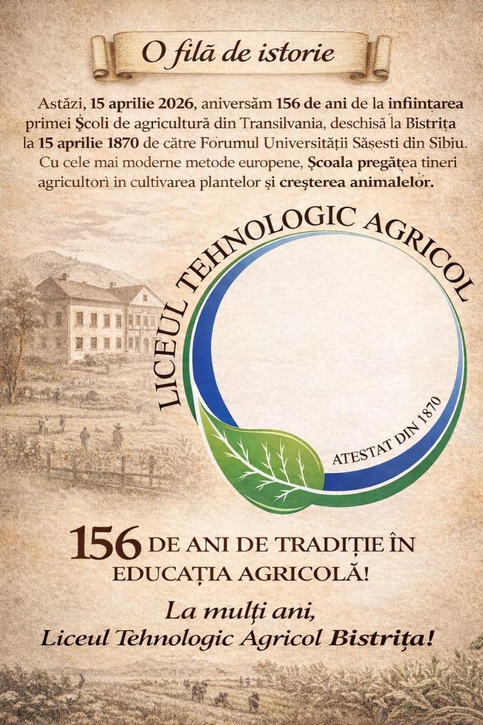 Marcăm aniversarea din acest an prin organizarea în data de 13 mai 2026, începând cu ora 12, la Complexul Muzeal Județean Bistrița-Năsăud, a unui eveniment comunitar de agroforum - “Școala, comunitatea și mediul academic - parteneri pentru viitor!” – eveniment organizat de Liceul Tehnologic Agricol Bistrița în parteneriat cu Universitatea de Științe Agricole și Medicină Veterinară din Cluj Napoca, prilej cu care va avea loc lansarea Clubului AgriSmart și la care sunt invitați: reprezentanți ai mediului economic, agenții economici parteneri de practică, reprezentanți ai administrației publice locale și județene, ai grupului de dialog social de la nivelul județului Bistrița-Năsăud, reprezentanți ai învățământului profesional și tehnic din județ.