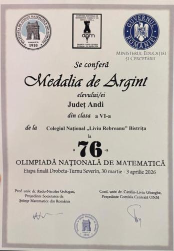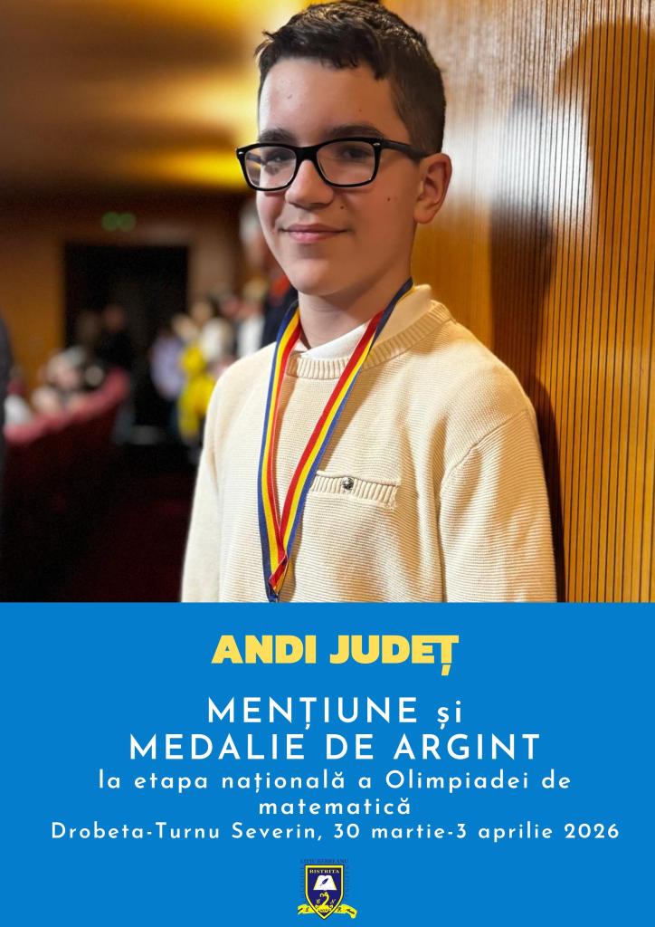 🔹Andi Județ, elev în clasa a VI-a A, prof. Nastasia Chiciudean, a obținut două distincții: Mențiune și Medalie de argint