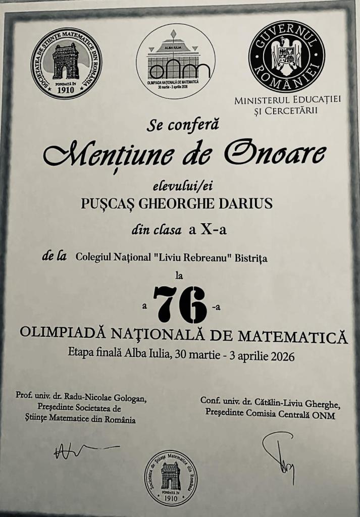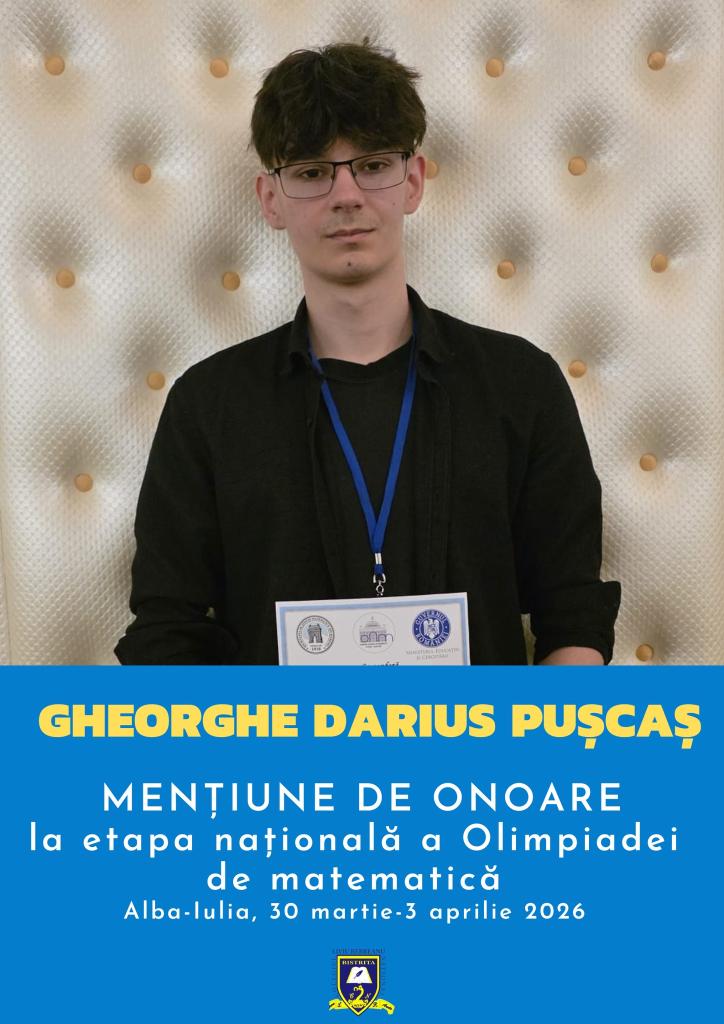 🔹Gheorghe Darius Pușcaș, elev în clasa a X-a B, prof. Iuliana Chilom, a obținut Mențiune de onoare