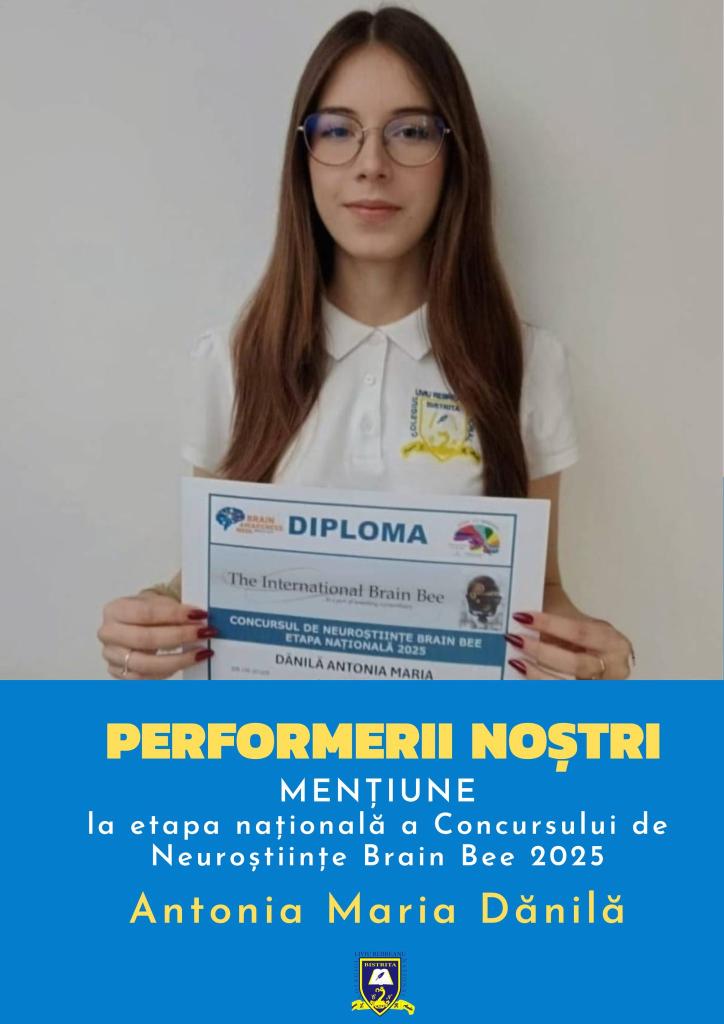 Eleva Antonia Maria Dănilă, din clasa a X-a C de la Colegiul Național "Liviu Rebreanu", a obținut mențiune la etapa națională a Concursului de Neuroștiințe Brain Bee, ediția 2025. Felicitări, Antonia!