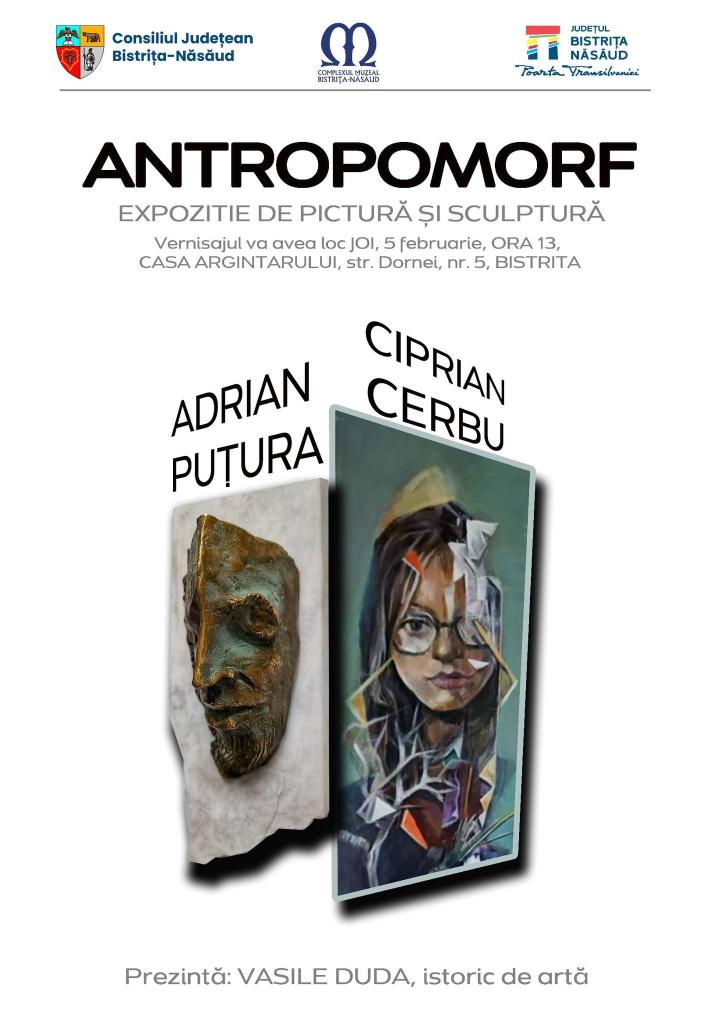 Expoziția Antropomorf reunește creațiile a doi artiști consacrați – Putura Adrian (sculptură) și Ciprian Cerbu (pictură), într-un dialog vizual dedicat explorării condiției umane și a formei antropomorfe.