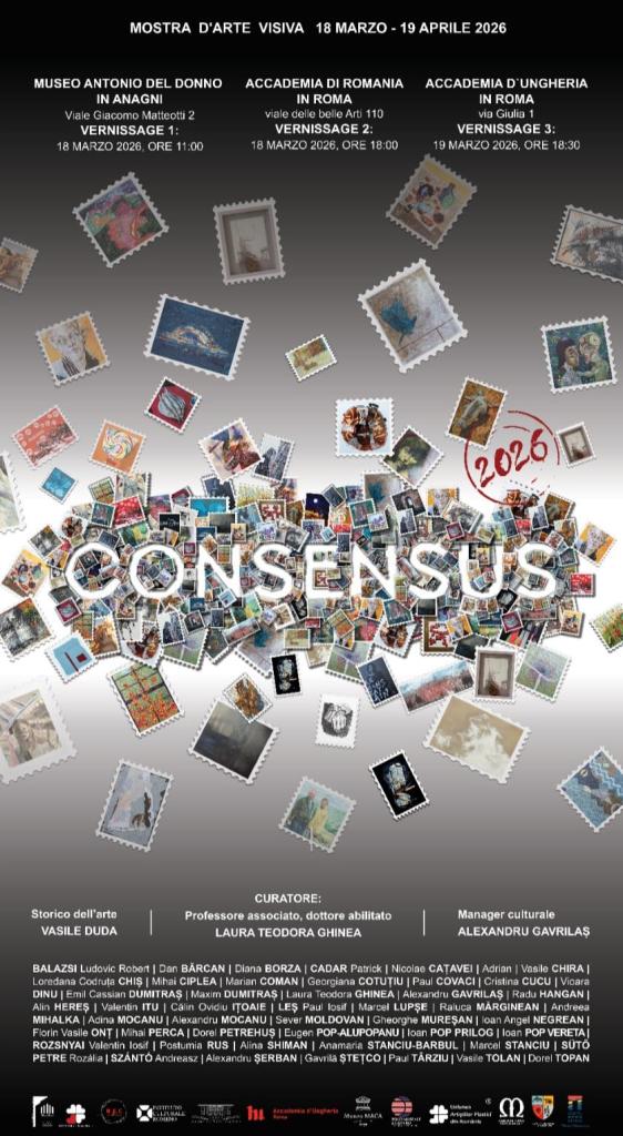Complexul Muzeal Bistrița-Năsăud anunță participarea artiștilor din cadrul Filialei Bistrița și Baia-Mare a Uniunii Artiștilor Plastici din România la expoziția internațională de artă contemporană „CONSENSUS”, desfășurată în perioada 18 martie – 19 aprilie 2026, la Academia Română Roma, Italia, Academia Maghiară Roma, Italia și la Muzeul Antonio Del Donno Anagni, Roma, Italia.