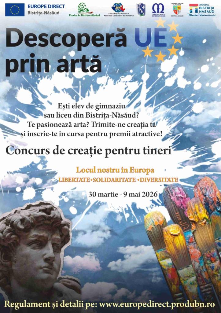 Ești elev de gimnaziu sau liceu din Bistrița-Năsăud și îți place arta? 🎨 Acum e momentul să-ți pui creativitatea în valoare și să ne arăți cum se vede Europa prin ochii tăi!🇪🇺