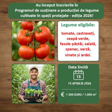 Au început înscrierile în Programul de susținere a producției de legume cultivate în spații protejate – ediția 2026, destinat sprijinirii producătorilor agricoli din sectorul legumicol. Fermierii pot depune cererile de înscriere până la data de 15 aprilie 2026, la Direcțiile Agricole Județene.