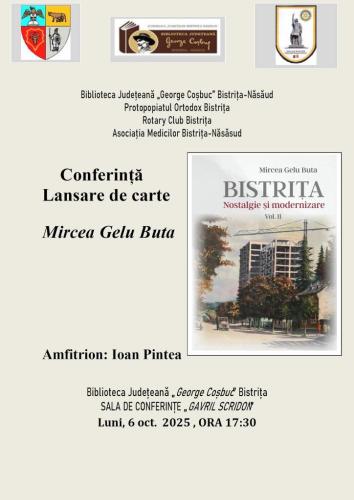 Consiliul Județean Bistrița-Năsăud, Biblioteca Județeană „George Coșbuc” Bistrița-Năsăud, Protopopiatul Ortodox Bistrița, Rotary Club Bistrița și Asociația Medicilor Bistrița-Năsăud vă invită luni, 6 octombrie 2025, ora 17:30, în Sala de Conferințe „Gavril Scridon” a Bibliotecii Județene (Bistrița, Str. Alexandru Odobescu, nr. 11) la Conferința și lansarea de carte: „Bistrița – nostalgie și modernizare” (volumul 2), susținute de către Domnul Profesor Universitar Doctor Mircea Gelu Buta.