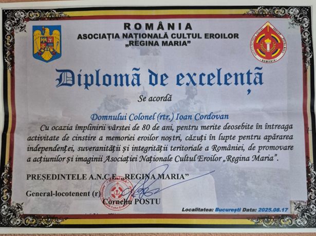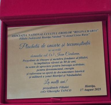 În partea ultimă a festivității col. (rtg.) Tanco Gheorghe a acordat din partea A.N.C.E.R.M.„Regina Maria”-Filiala Județeană Bistrița-Năsăud, col. (rtg.) Cordovan Ioan o plachetă omagială dedicată împlinirii frumoasei vârste de 80 de ani, precum și o Diplomă de Excelență trimisă de către generalul maior (cu două stele) Corneliu Postu_președintele executiv al ANCERM „Regina Maria”-București.