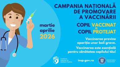 În perioada martie-aprilie 2026, sub sloganul „Copil vaccinat = copil protejat”, în România se va derula Campania națională de promovare a vaccinării. În cadrul campaniei, la nivelul întregii țări se vor desfășura activități legate de promovarea vaccinării copilului, conform Calendarului Național de Vaccinare. Această inițiativă urmărește să îmbunătățească nivelul de conștientizare cu privire la importanța vaccinării și să încurajeze părinții să-și protejeze copiii împotriva bolilor care pot fi prevenite prin vaccinare.
