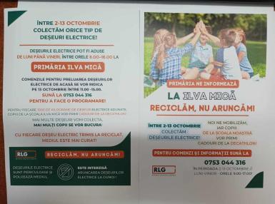 În perioada 2-13 octombrie, Primăria Ilva Mică derulează o campanie de colectare a deşeurilor electrice, în coordonarea viceprimarului Ilie Muşină. Potrivit anunţului transmis de Primăria Ilva Mică, deşeurile electrice pot fi aduse de luni până vineri, între orele 8-16, la sediul instituţiei. De asemenea, se pot face comenzi pentru preluarea deşeurilor electrice de la domiciliu, acestea urmând să fie colectate vineri, 13 octombrie.