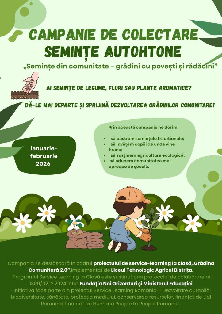 Liceul Tehnologic Agricol Bistrița lansează Campania de colectare a semințelor autohtone, desfășurată în cadrul proiectului de service-learning la clasă „Grădina Comunitară 2.0”, o inițiativă care își propune să valorifice patrimoniul vegetal local și să implice comunitatea în educația pentru sustenabilitate.