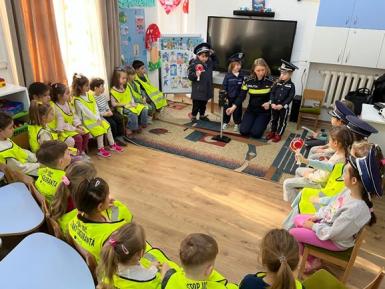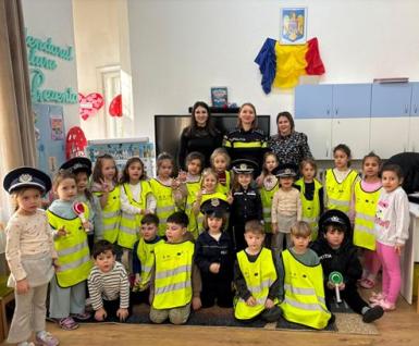 În cadrul temei săptămânii, „Cea mai frumoasă meserie”, preșcolarii grupei mari A „Strumfii” au avut parte de o activitate deosebită și plină de învățăminte. Cei mici au primit vizita doamnei inspector principal de poliție Cozma Lenuța, din cadrul Biroul de Siguranță Școlară al Inspectoratului de Poliție Județean Bistrița–Năsăud, care le-a vorbit cu multă căldură despre meseria de polițist și despre importanța respectării regulilor de circulație.