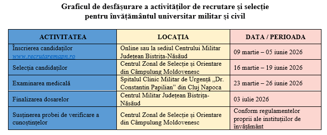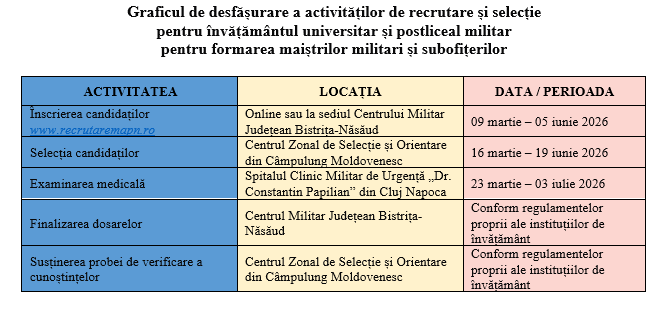Persoanele domiciliate în judeţul Bistriţa-Năsăud, care vor să urmeze o carieră militară, prin absolvirea instituţiilor de învăţământ militar universitar, postliceal sau liceal, trebuie să parcurgă următorii paşi:
