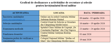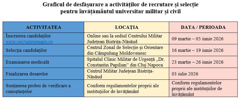 În baza Planului de școlarizare al Ministerului Apărării Naționale pentru anul de învățământ 2026-2027, Biroul Informare-Recrutare din cadrul Centrului Militar Județean Bistrița-Năsăud continuă înscrierile pentru: