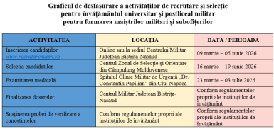 Persoanele domiciliate în judeţul Bistriţa-Năsăud, care vor să urmeze o carieră militară, prin absolvirea instituţiilor de învăţământ militar universitar, postliceal sau liceal, trebuie să parcurgă următorii paşi:
