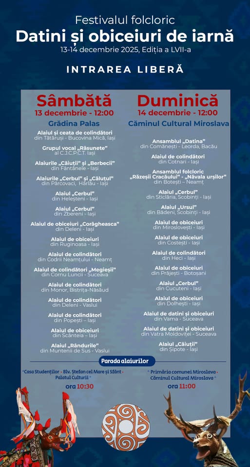 Eu particip alături de Cornelia și de monoreni la Iași de ani buni la acest eveniment unic! Sunt de-a dreptul uluit de cele văzute acolo: o organizare incredibilă, calitate și respect pentru tradiții, totul pus la punct militărește, într-o concepție unică și unitară care nu lasă loc cunoscutelor, de prin alte părți, amatorisme bazate pe ambiții personale narcisiste! Si noi bistrițenii ne putem prezenta la apel cu mândrie însă Spiritul Iașului nu poate fi egalat! Deocamdată! Eu privesc asta ca pe un motiv de bucurie, ca pe un îndemn, ca pe o speranță și nicidecum nu ca pe o critică oricât de voalată ar putea să pară părerile mele! Festivalul folcloric „Datini și Obiceiuri de Iarnă” aduce an de an în fața publicului farmecul străvechi al tradițiilor românești de iarnă. Într-o atmosferă plină de culoare, colinde, jocuri cu măști, alaiuri de datini și costume populare autentice, cu participanți din diferite zone ale țării cu toții preocuoați să reînvie obiceiurile care au însoțit de generații sărbătorile de iarnă. Evenimentul de la Iași își propune și reușește prin toată concepția, organizarea și desfășurarea sa să păstreze vie moștenirea spirituală a satului românesc și să ofere comunității ocazia de a redescoperi frumusețea ritualurilor ce vestesc Nașterea Domnului și trecerea în noul an.