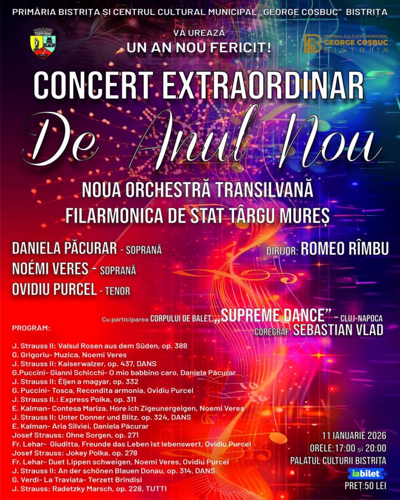 Avem bucuria de a vă invita la tradiţionalul CONCERT EXTRAORDINAR DE ANUL NOU organizat de Primăria Bistriţa şi Centrul Cultural Municipal “George Coşbuc”!