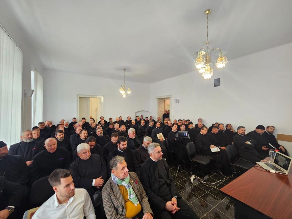 După momentul liturgic, lucrările propriu-zise ale conferinței s-au desfășurat în sala de ședințe a Protopopiatului Ortodox Bistrița, în prezența ierarhului și a preoților.