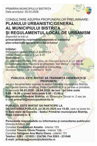 Publicul este invitat să transmită observații și propuneri asupra documentelor expuse la sediul Primăriei municipiului Bistrița, holul public / panou de afișaj, Piața Centrală nr. 6 și pe site-ul primăriei, în perioada 06.03.2026 – 24.04.2026, de luni – joi, între orele 9.00 – 16.00 și vineri între orele 9.00 -13.00, la Registratura Primăriei Bistrița, str. Gheorghe Șincai nr. 2, sau pe e-mail [email protected]