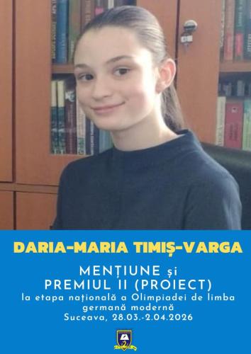 - Felicitări! Daria-Maria Timiș-Varga, de la "Avram Iancu", locul al II-lea la Olimpiada Națională de Limba și literatura română!