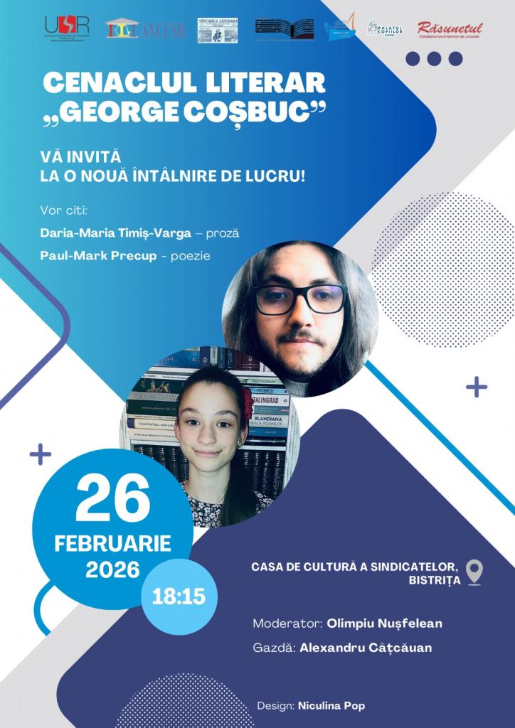 Cenaclul „George Coșbuc”, Bistrița ne invită la o nouă ședință de lucru joi, 26 februarie, ora 18 și un sfert, la Casa de Cultură a Sindicatelor, Bistrița. Doi tineri condeieri promițători ai Bistriței – Daria-Maria Timiș-Varga și Paul-Mark Precup – vor citi proză și poezie.