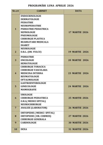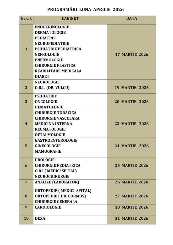 Datele de la care se vor putea face programări la specialitățile medicale / paraclinice din Policlinica Bistrița, pentru luna aprilie 2026.