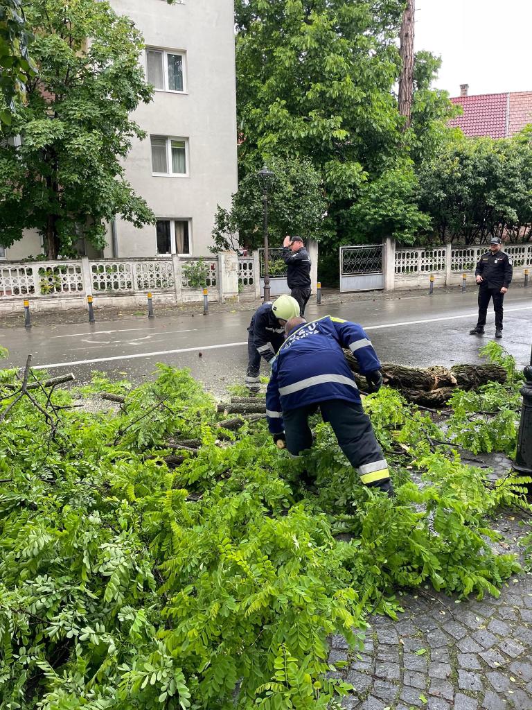 Tot din cauza vântului, pe strada Nicolae Titulescu, un copac a fost rupt. Și aici, echipa SVSU a intervenit rapid pentru a degaja partea carosabilă și trotuarul, asigurând circulația în condiții de siguranță.