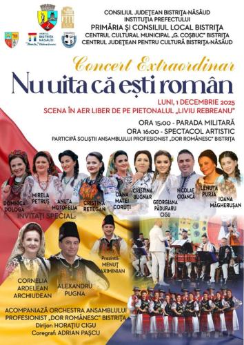 CONSILIUL JUDEȚEAN BISTRIȚA-NĂSĂUD, INSTITUȚIA PREFECTULUI, PRIMĂRIA ȘI CONSILIUL LOCAL BISTRIȚA, CENTRUL CULTURAL MUNICIPAL „G. COȘBUC” BISTRIȚA și CENTRUL JUDEȚEAN PENTRU CULTURĂ BISTRIȚA-NĂSĂUD organizează Concertul Extraordinar „Nu uita cã ești român”.