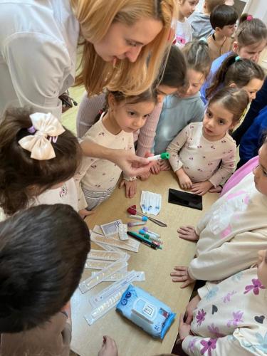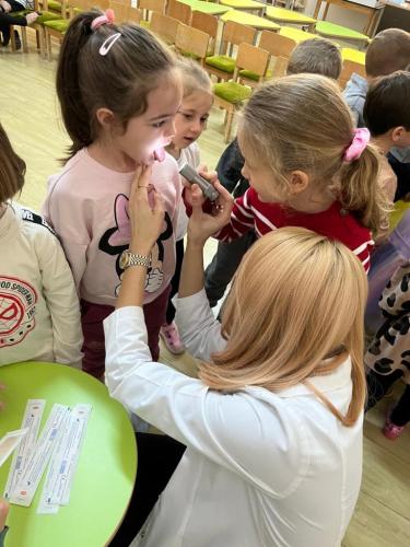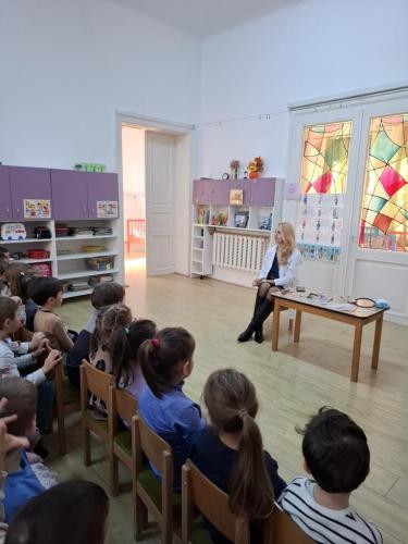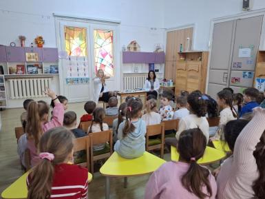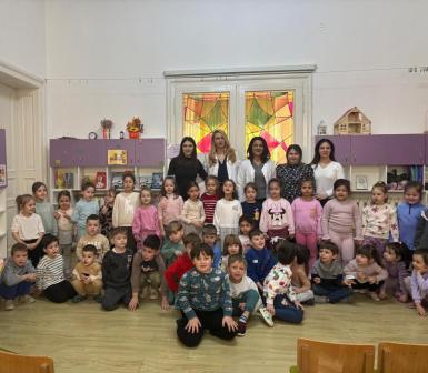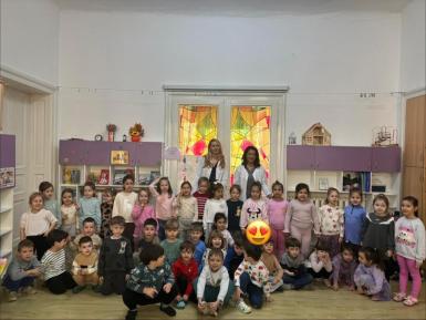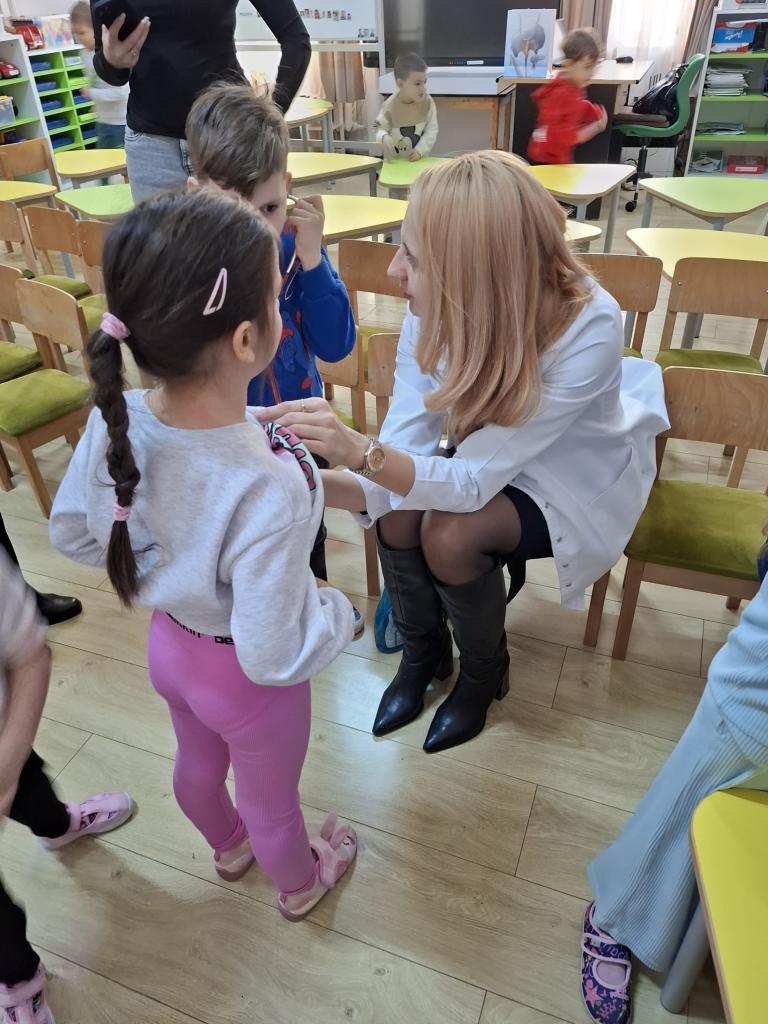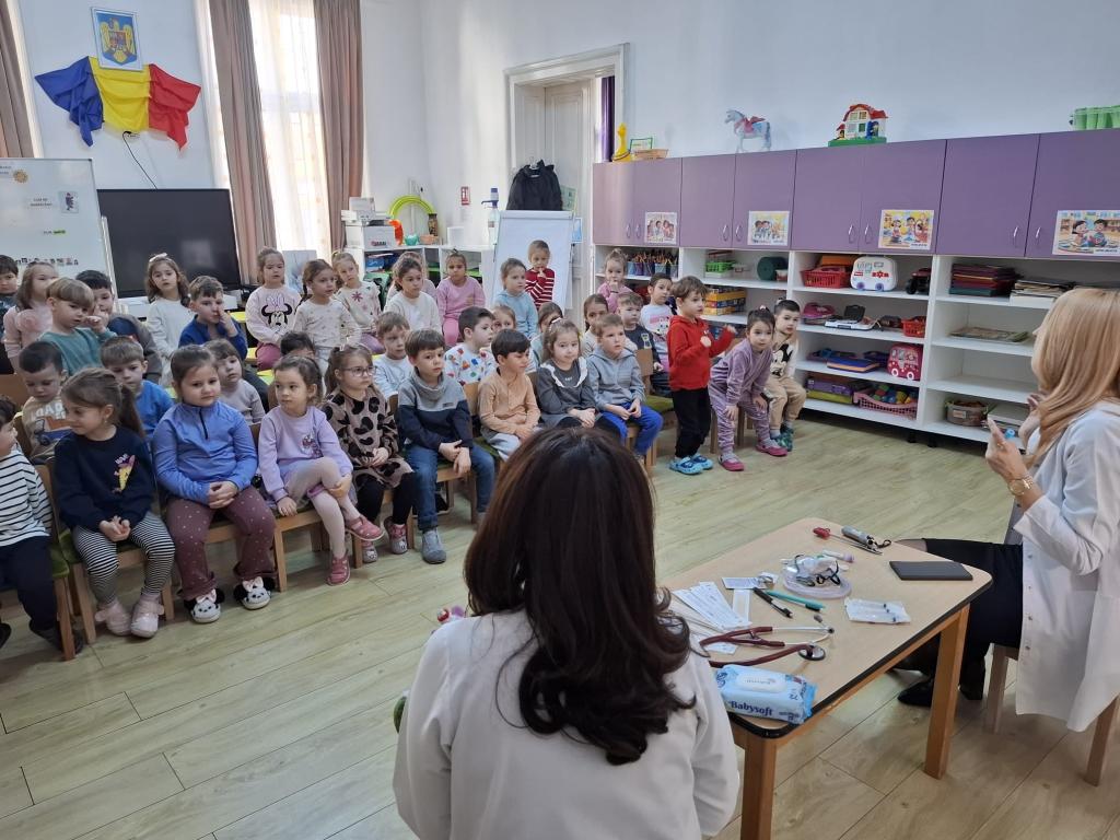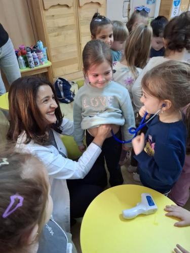 Doamna dr. Heidi Adumitrăchioaiei, medic pediatru în cadrul UPU Pediatrie al Spitalului Județean Bistrița ne-a făcut o mare bucurie prin vizita la grădiniță și prin modul cald și răbdător în care le-a vorbit copiilor despre meseria sa. Copiii au aflat ce înseamnă un control medical, la ce folosesc stetoscopul și termomentrul, importanța formării unor obiceiuri sănătoase încă de la o vârstă fragedă.
