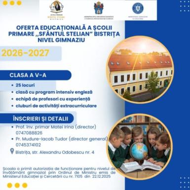 Școala Primară „Sfântul Stelian” din Bistrița își extinde oferta educațională pentru anul școlar 2026–2027, anunțând școlarizarea elevilor în clasa a V-a, la nivel gimnazial.