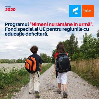 “Nimeni nu rămâne în urmă” este unul dintre obiectivele Alianței 2020 USR PLUS pentru Parlamentul European. Propunem crearea unui fond special la nivelul UE pentru regiunile cu educație deficitară deoarece educația este domeniul cel mai important în dezvoltarea țării.