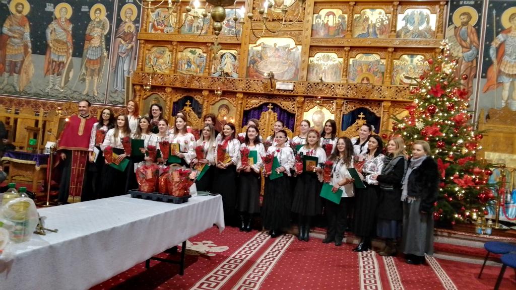 Darul de Crăciun al parohiei pentru colindătoare a fost câte o icoană, o floare și mulțumirile arătate de credincioși pentru încântătorul recital.