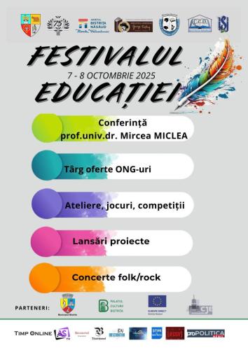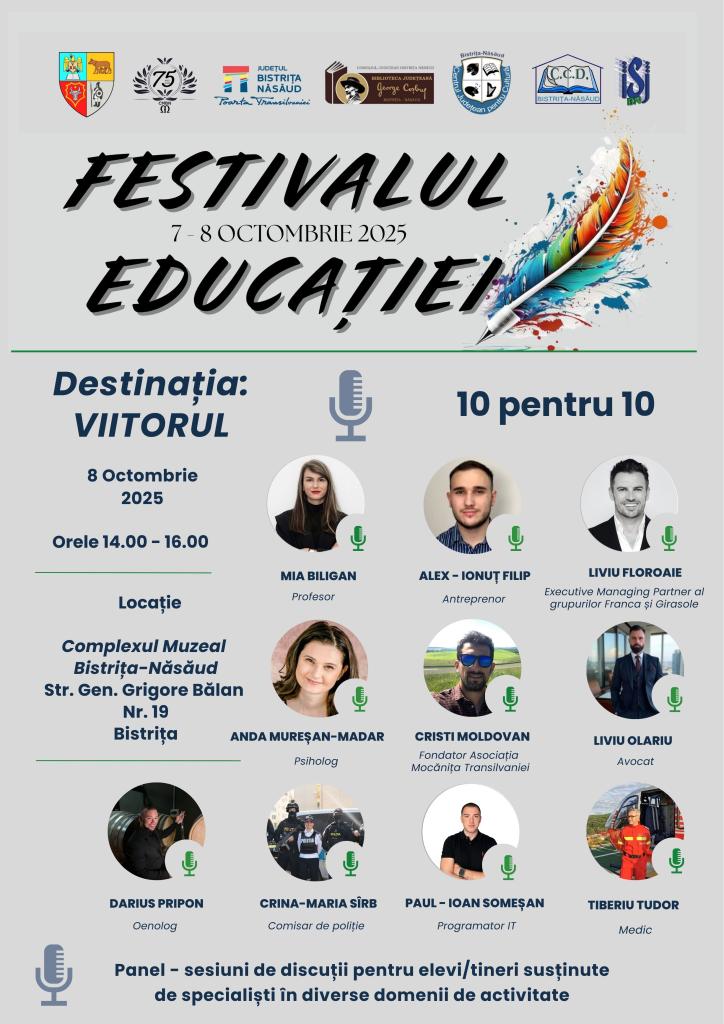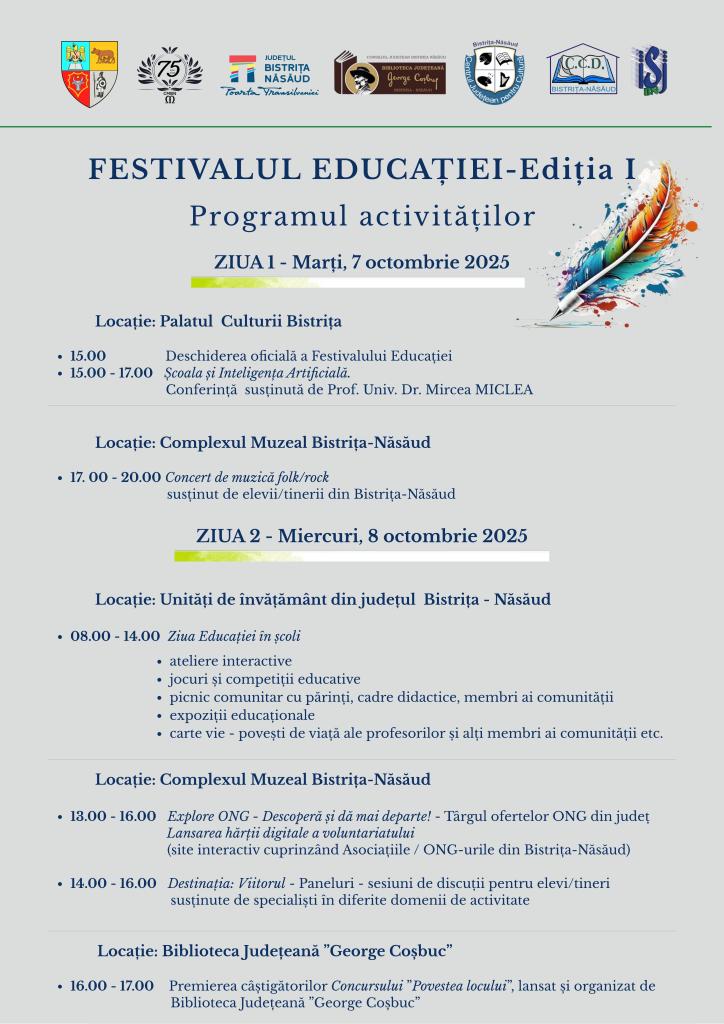 Bistrița găzduiește, în perioada 78 octombrie 2025, prima ediție a Festivalului Educației, un eveniment dedicat școlii, inovației și comunității. Organizat sub semnul dialogului dintre generații și al deschiderii spre viitor, festivalul aduce împreună profesori, elevi, părinți, specialiști și ONG-uri, într-un program variat care îmbină știința, educația și spiritul comunitar.