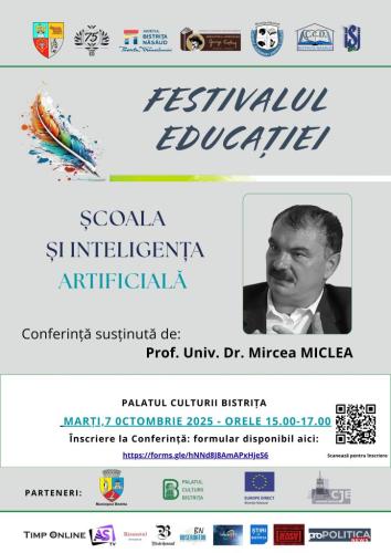 Conferința „Școala și Inteligența Artificială” susținută de prof. univ. dr. Mircea Miclea (Palatul Culturii Bistrița,7 octombrie);