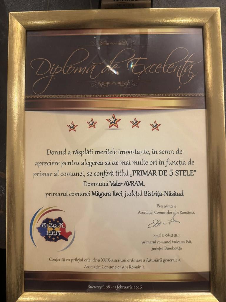 ÎN perioada 8 -11 februarie 2026, la București are loc Adunarea generală a Asociației Comunelor din România (ACoR), în cea de-a 29-a sesiune ordinară și Consiliul director al ACoR, în ședință ordinară pe semestrul I/2026. Pe agenda lucrărilor, luni a fost inclusă și conferirea distincțiilor ACoR,primarul Valer Avram de la Măgura ILvei priminnd troful și Diploma de ecxelență „Primar de 5 stele".