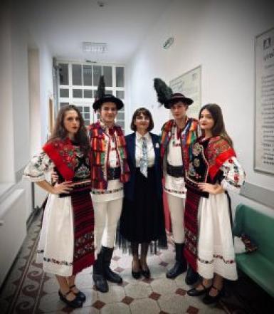 Delegația de profesori din Chișinău a sosit în incinta colegiului din Bistrița la ora 09:00, fiind întâmpinată cu pâine și sare de elevi îmbrăcați în costume populare.