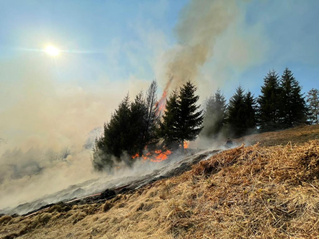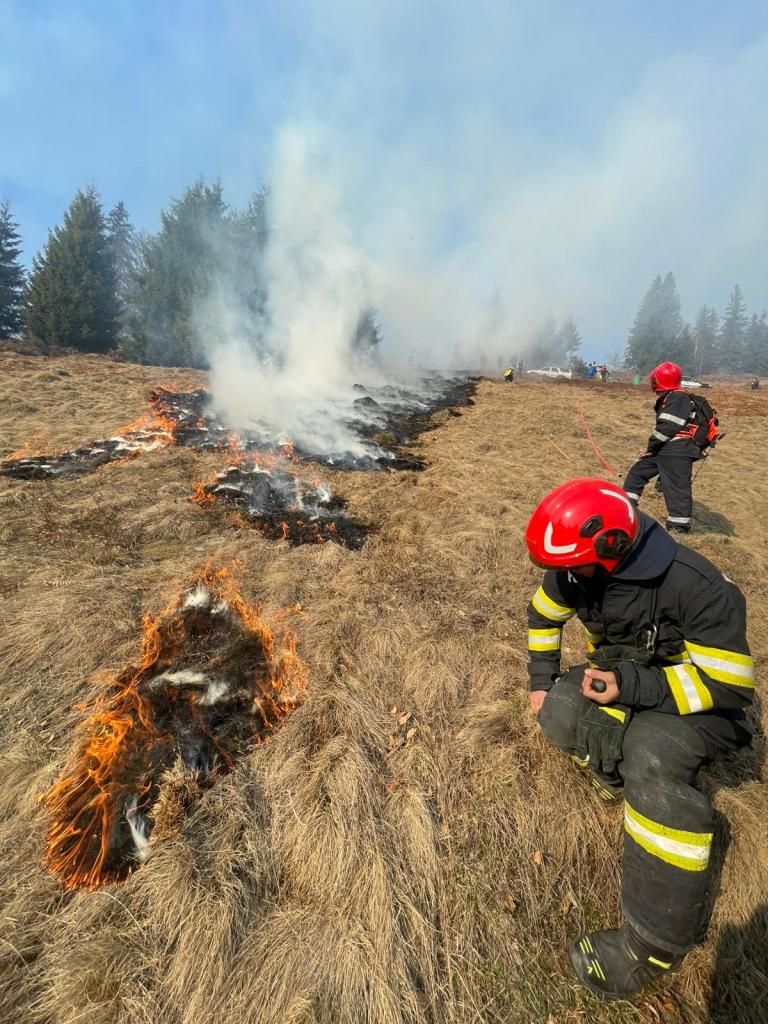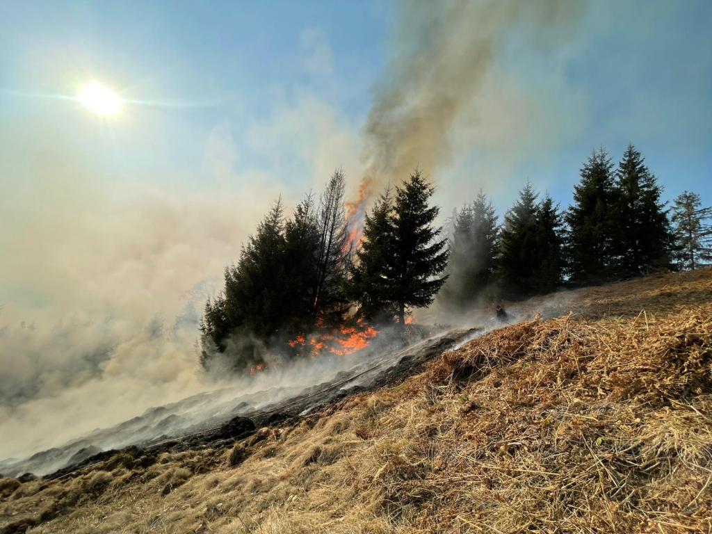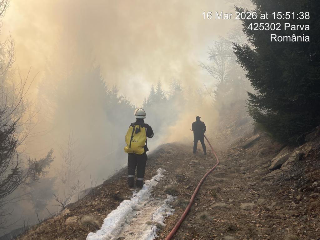 Intervenția pentru stingerea incendiului de pădure izbucnit în localitatea Parva, zona pășunii Comarnic, continuă.