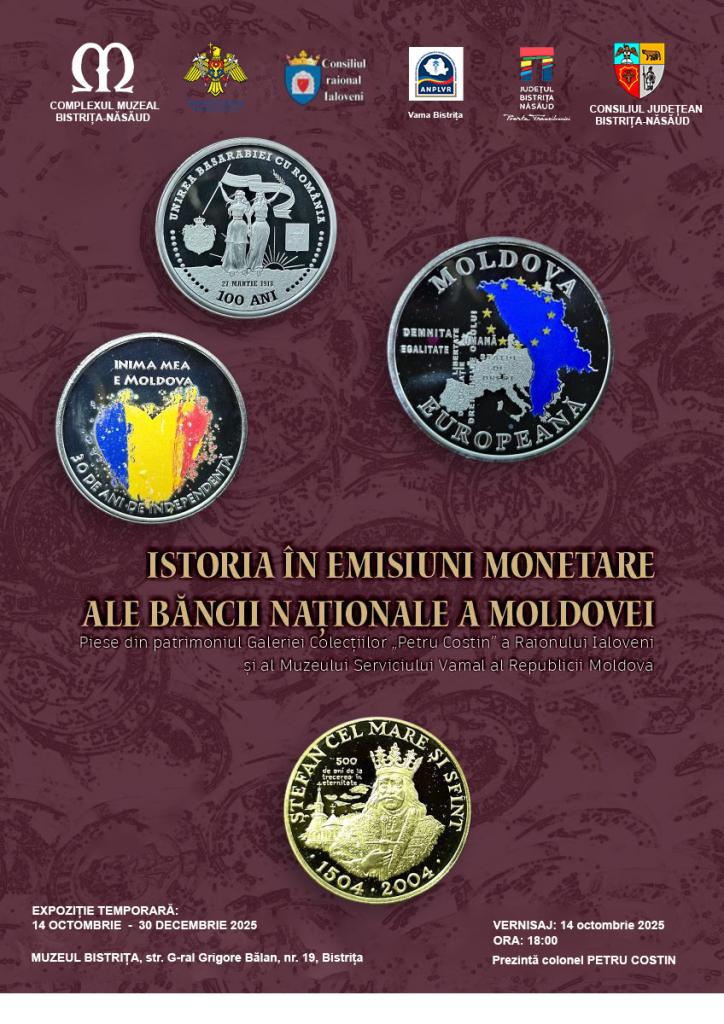 Complexul Muzeal Bistrita-Nasaud, în parteneriat cu Consiliul Raional Ialoveni, Serviciul Vamal al Republicii Moldova și Asociația Națională Profesională a Lucrătorilor Vamali din România, organizează în perioada 14 octombrie – 30 decembrie 2025, la Muzeul Bistrița, expoziția temporară “Istoria în emisiuni monetare ale Băncii Naționale a Moldovei. Piese din patrimoniul Galeriei Colecțiilor “Petru Costin” a Raionului Ialoveni și al Muzeului Serviciului Vamal al Republicii Moldova”.