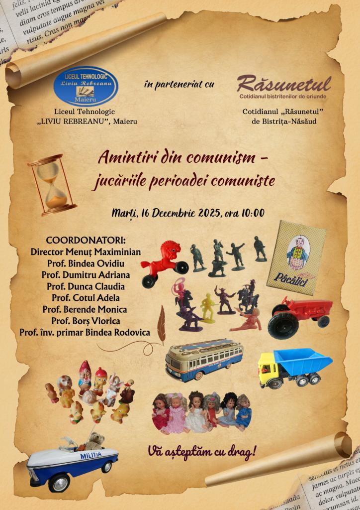 În „Săptămâna altfel”, un grup de cadre didactice de la Liceul Tehnologic „Liviu Rebreanu”, Maieru, sprijiniți și de elevii din gimnaziu, la inițiativa dlui prof. dr. Bindea Ovidiu, au realizat o expoziție inedită de jucării vechi, din perioada comunistă, majoritatea exponatelor făcând parte din colecția personală a domnului profesor, alte câteva jucării aparținând celorlalți dascăli organizatori: Rodovica Bindea, Claudia Dunca, Adela Cotul, Viorica Borș, Monica Berende și Adriana Dumitru.