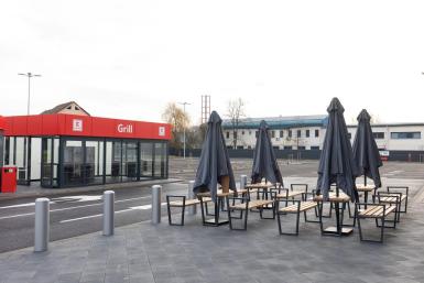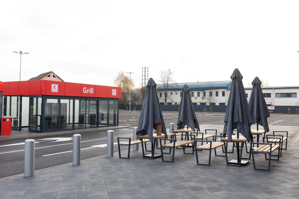 La punctul Grill din exterior, clienții sunt așteptați cu un meniu variat de preparate gustoase, gata de savurat: pui rotisat (condimentat sau cu usturoi), pulpe de pui rotisate, crispy și nuggets de pui, cartofi prăjiți, mici, ceafă de porc și Thuringer. Oferta este completată de o selecție de băuturi răcoritoare și diverse sosuri.