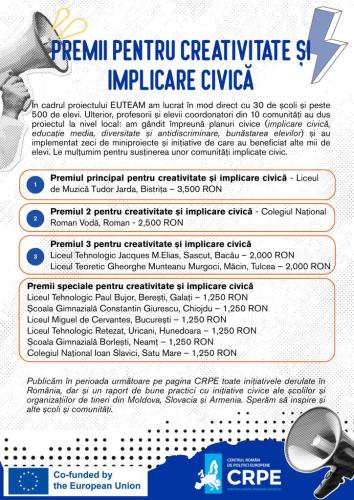 Cu mare mândrie anunțăm câștigarea Premiului principal pentru creativitate și implicare civică, în valoare de 3.500 RON, din cadrul proiectului EUTEAM, acordat de către CRPE pentru "Map of Wellbeing and Democracy", un plan de acțiune care a vizat educația non-formală pentru cetățenie democratică și stare de bine prin activități de teatru-ziar și benzi desenate. Acest proiect nu ar fi fost posibil fără ajutorul partenerilor noștri: Liceul Teoretic Sanitar, Colegiul Național "Liviu Rebreanu" Bistrița, Biblioteca Județeană "George Coșbuc" Bistrița-Năsăud și Asociația Educatistic, cărora le mulțumim pentru colaborare!