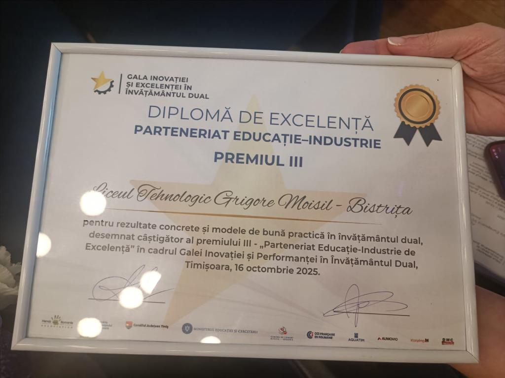 Liceul Tehnologic "Grigore Moisil" Bistrița - Diplomă de Excelență și Premiul III la categoria „Partener Educație – Industrie” la Gala Inovației și Performanței în Învățământul Dual