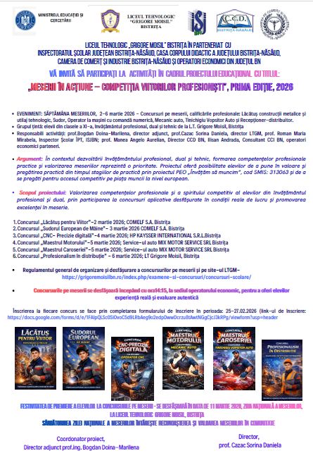 Liceul Tehnologic "Grigore Moisil" Bistrița în parteneriat cu Inspectoratul Școlar Județean Bistrița-Năsăud, Casa Corpului Didactic Bistrița, Camera de Comerț și Industrie Bistrița-Năsăud și operatori economici organizează proiectul educațional "Meserii în acțiune – Competiția viitorilor profesioniști", ediția I, 2026. Evenomentul are loc în cadrul Săptămânii meseriilor, 2-6 martie, și cuprinde concursuri pe meserii, calificările profesionale: Lăcătuș construcții metalice și utilaj tehnologic, Sudor, Operator la mașini cu comandă npentru umerică, Mecanic auto, Tinichigiu Vopsitor Auto și Recepționer-distribuitor. La aceste concursuri vor participa elevii din clasele a XI-a, învățământul profesional, dual și tehnic de la L.T. Grigore Moisil, Bistrița.