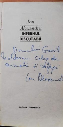 Aşa se explică autograful alăturat ce conţine sintagma ,,coleg de armată şi solfegii’’. Ioan Alexandru a rămas şi va rămâne un reper important în viaţa mea, pentrucă el m-a încurajat mereu să scriu, cu generozitatea-i şi s-a bucurat la debutul meu în ,,Tribuna’’. După 1989 ne-am reîntâlnit la Colegiul naţional ,,Liviu Rebreanu’’ Bistriţa, unde el a avut o întâlnire cu elevii acestei şcoli şi cu profesorii. Eu mă aflam acolo în calitate de reporter al ziarului local. Am şi scris de fapt despre acea întâlnire un material intitulat ,,Achiziţionaţi duhul sfânt,’’ publicat în ziarul amintit, reproducând o sintagmă rostită de înflăcăratul poet în timpul acelei întâlniri. Era alt om acum, un intelectual deja format. Sorbise din cultura germană, îi citise pe reprezentanţii curentului existenţialist în filosofie şi se apropiase de cultura iudaică, intuind cu exactitate componenta esenţială iudeo-creştină a culturii europene. L-am întrebat atunci cu sfială de ce şi-a schimbat numele din Ion în Ioan, la care el a răspuns că ,,în viaţa omului se petrec taine greu de explicitat.’’ Întâlnirea de la liceul bistriţean s-a transformat în cele din urmă într-un dialog cu publicul. Îmi amintesc că am pus şi eu o întrebare legată de definirea conceptului de angoasă la Heidegger, la care Ioan Alexandru a răspuns cu aceeaşi revărsare de sentimente ce-i era caracteristică. Moartea sa prematură m-a cutremurat. El mai putea să dea multe culturii române, dar destinul a vrut altceva. Bistriţa i-a rămas recunoscătoare şi din iniţiativa unor foruri culturale locale a fost dezvelit, la Biblioteca judeţeană, un bust al său în prezenţa familiei sale, bust care şi astăzi străjuieşte aleile acestei instituţii. Ioan Alexandru va rămâne o frumoasă amintire a tinereţei mele, emblema unui poet şi om de cultură religios, mare cărturar care şi-a iubit poporul şi ţara.