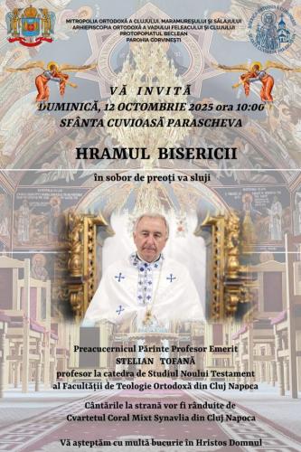 - Hramul Bisericii „Sfânta Cuvioasă Parascheva” din Corvinești! Preacucernicul conf. univ. dr. Ioan Bizău va oficia, în sobor de preoți, Sfânta Liturghie