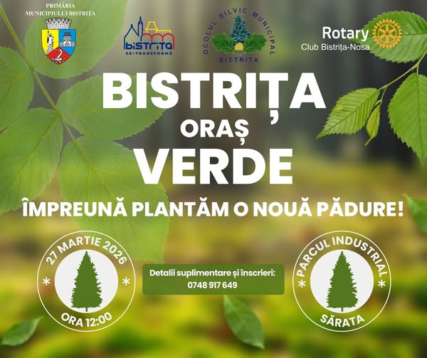 Primăria municipiului Bistrița, în parteneriat cu Ocolul Silvic Municipal și Rotary Club Bistrița-Nosa, organizează în data de 27 martie 2026, ora 12:00, în zona Parcului Industrial Sărata, o acțiune de împădurire, sub mesajul „Bistrița – oraș verde”.