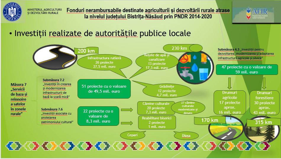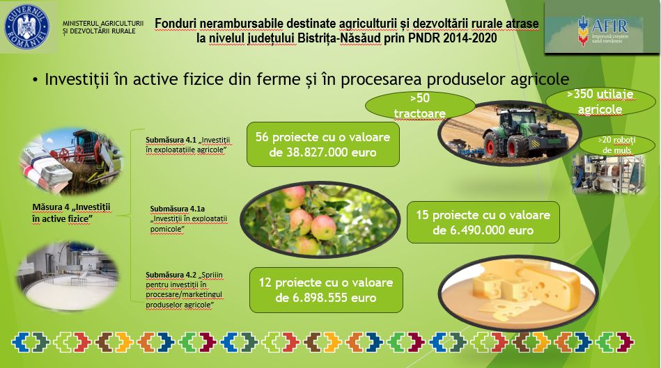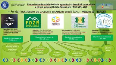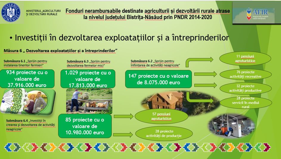 La nivelul județului Bistrița-Năsăud, prin Programul Național de Dezvoltare Rurală 2014-2020, s-a reușit absorbție de aproximativ 270 milioane euro, potrivit datelor furnizate de Sorin Roșu-Mareș, director la Oficiul Judeţean pentru Finanțarea Investițiilor Rurale Bistrița-Năsăud. Aceste fonduri atrase reprezintă investiții care însumează 2.200 exploatații agricole susținute; 934 tineri instalați prima dată ca șefi de exploatație; 23 cooperative finanțate; 125 hectare de livezi modernizate; 15 unități de procesare materie primă; 700 km de drumuri modernizați; 230 km de conducte de apă și canalizare; 100 unități de producție în mediul rural; 140 unități de primire turistică și proiecte de servicii turistice în mediul rural; 21 Puncte Gastronomice Locale; 5 Grupuri de Acțiune Locală (GAL-uri) finanțate; 44 proiecte de dotare a primăriilor cu utilaje pentru situații de urgență și gospodărire locală.