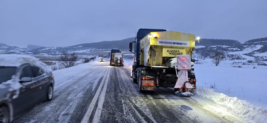 Toate utilajele de deszăpezire contractate sau aflate în dotarea autorităților competente acționează la capacitate operațională maximă. Nu există echipamente retrase, indisponibile sau inactive. Intervențiile vizează în principal drumurile naționale și județene, cu prioritate pe sectoarele cu risc ridicat de blocaj sau pe traseele esențiale pentru traficul rutier, transportul public și accesul către unități spitalicești ori de interes strategic.
