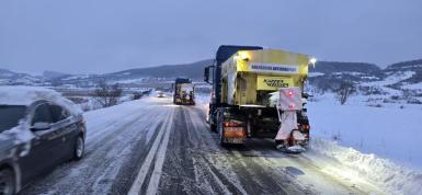 În paralel, pe drumurile județene s-a acționat cu 32 de autovehicule dotate cu lamă și echipamente de răspândire, intervențiile fiind realizate pe sectoarele afectate de ninsoare. Cantitatea totală de material antiderapant utilizată pe rețeaua județeană a fost de aproximativ 800 de tone.