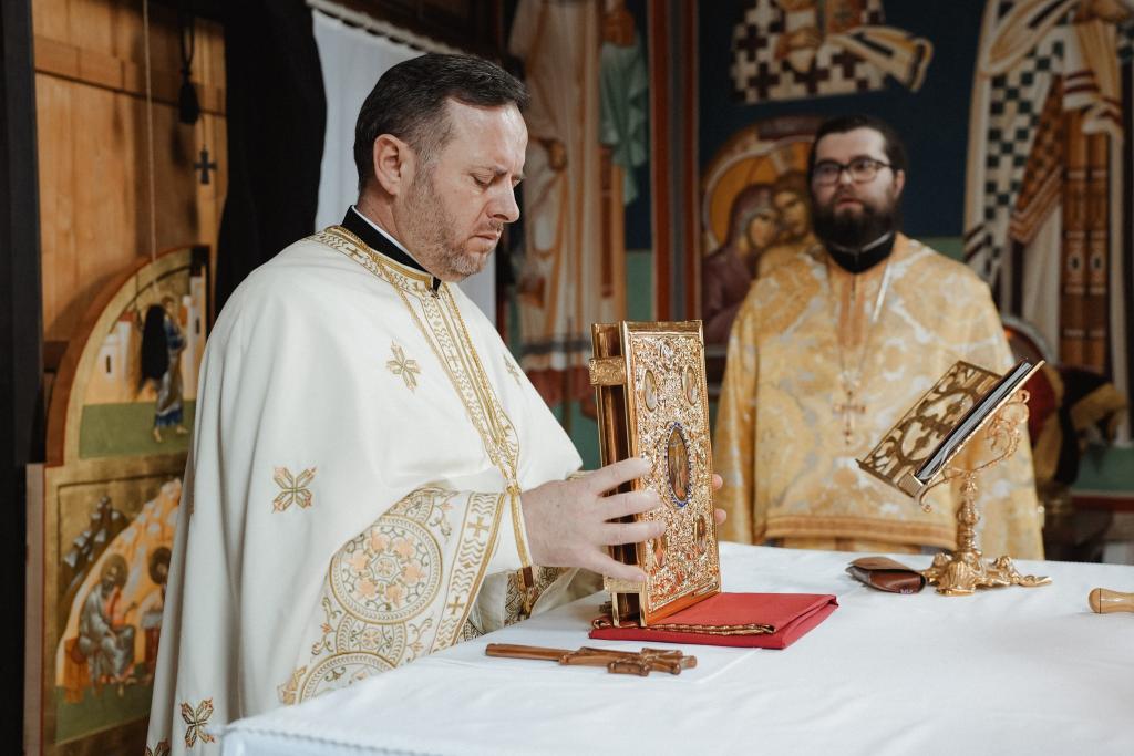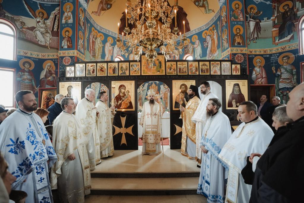 În biserica așezământului monahal, care îl are ca ocrotitor spiritual pe Sfântul Cuvios Paisie Aghioritul, ierarhul a oficiat Sfânta Liturghie, înconjurat de un sobor de clerici. Din sobor au făcut parte: consilierul de misiune și protocol – arhidiaconul Sergiu-Iustin Pop, protopopul de Beclean – preotul Cristian Dragoș, eclesiarhul Catedralei Episcopale din Zalău – preotul Adrian Onica, proin-protopopul Vicențiu Doru Zinveliu, starețul Mănăstirii Pantocrator – protosinghelul Luca Gheberta, precum și alți preoți invitați.