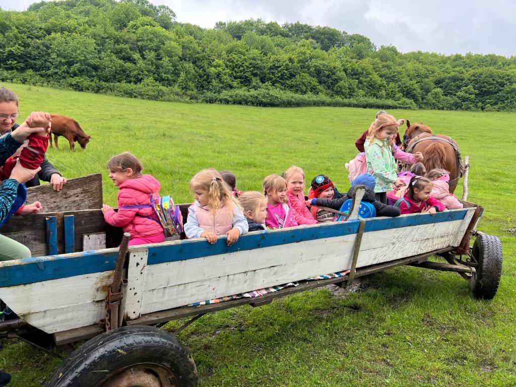 Ziua a continuat cu o drumeție prin împrejurimile pitorești ale zonei, unde copiii au explorat natura în pași jucăuși, au admirat peisajele și s-au bucurat de aer curat, într-un cadru relaxant și educativ deopotrivă. Plimbarea cu căruța trasă de căluțul prietenos ”Roua”, sub atenta supraveghere a d-lui Pop Octavian, a fost atracția zilei. Cu ochii plini de curiozitate și zâmbete largi, copiii au urcat cu emoție în căruță, nerăbdători să pornească în mica lor aventură. A fost o experientă unică pentru preșcolari.