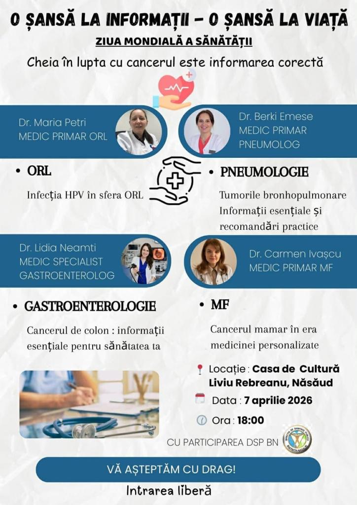 Vă invităm cu drag mâine, 7 aprilie 2026, de la ora 18:00, la Casa de cultură "Liviu Rebreanu", la un eveniment de informare pe mai multe domenii medicale.